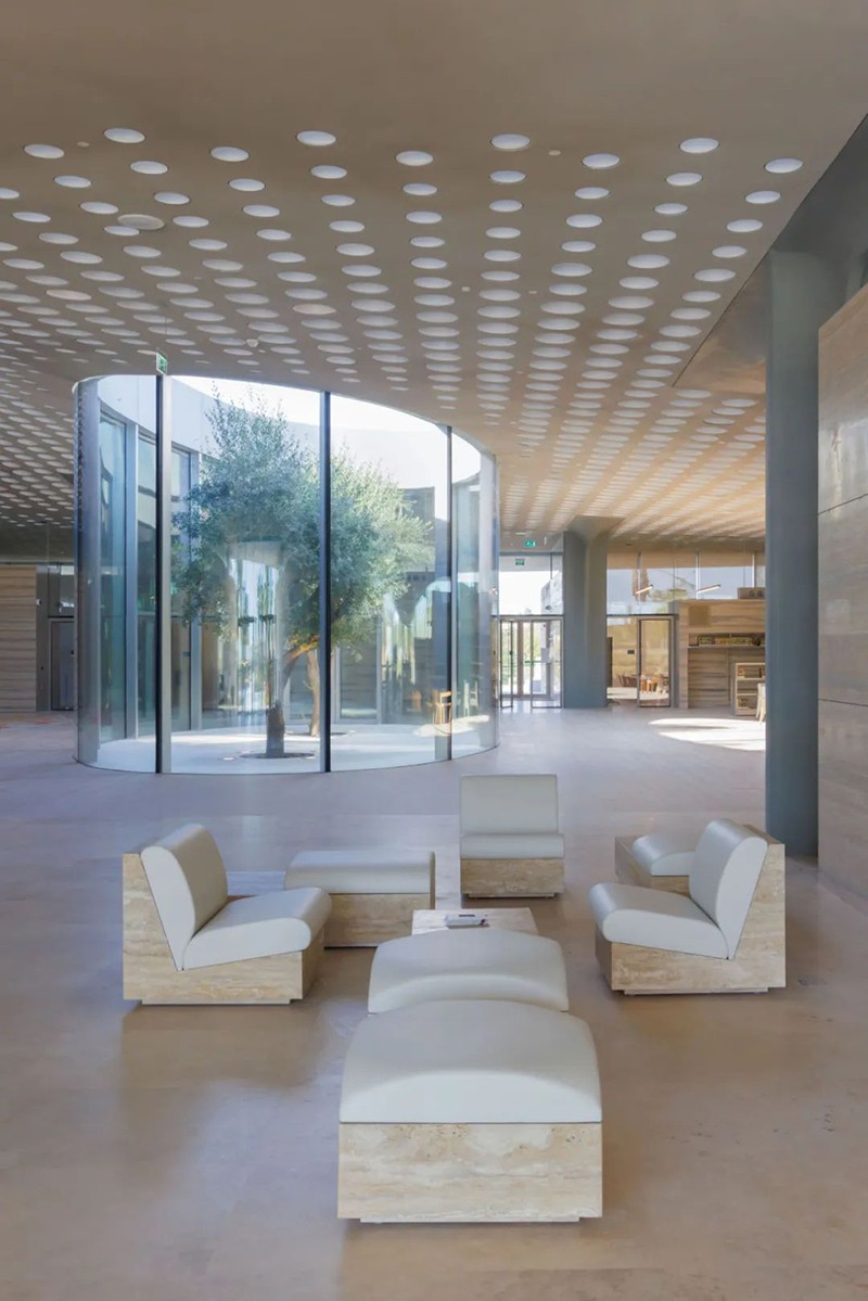 建筑的波浪形屋頂象征女性持續向上、自我成長的力量。兩棵橄欖樹穿過屋頂結構、向天而立,寓意和平與生命的延續。室內外空間通過庭院與花園過渡連接,強化了人與自然的精神交匯,為來訪者提供安靜冥想與社區互動的可能。