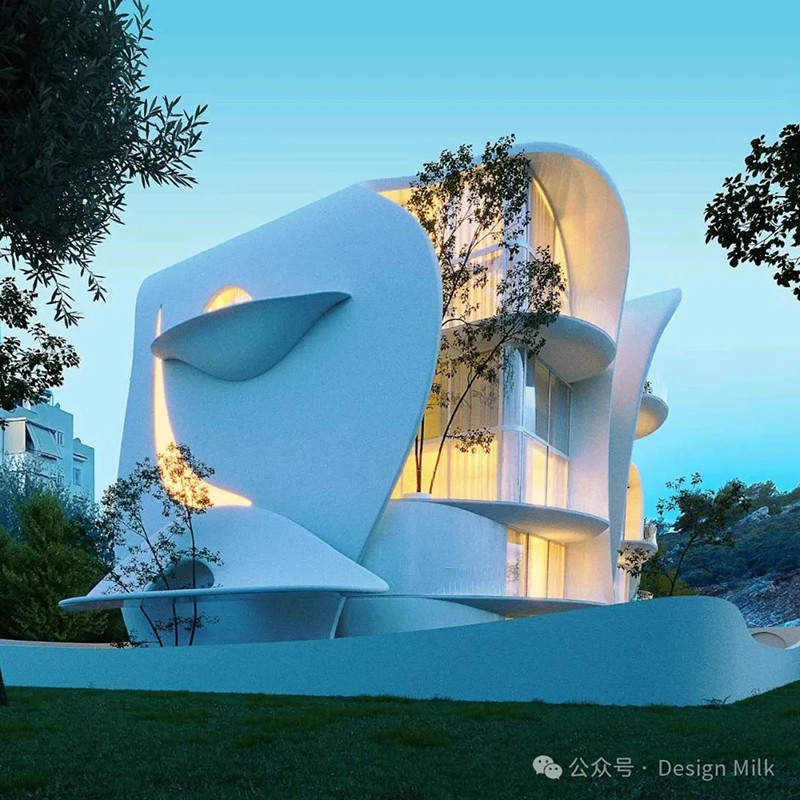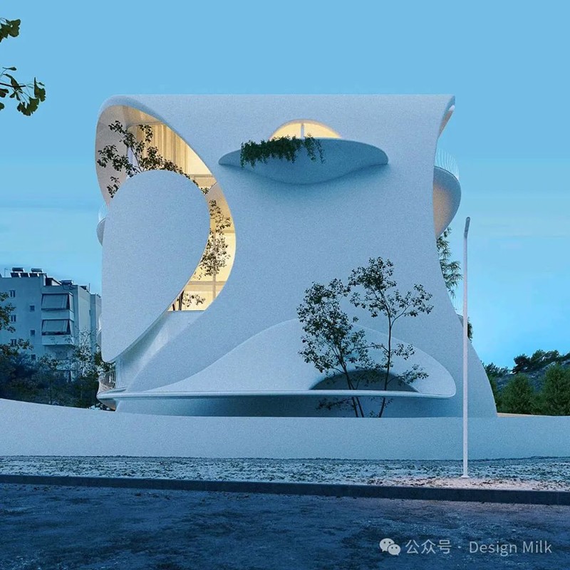 外表面光滑、潔白,加上精心布置的燈光,凸顯了建筑復(fù)雜的輪廓。 設(shè)計中融入了大型圓形開口和彎曲的陽臺,可以看到室內(nèi)景象,并提供與外部無縫融合的室外空間。 這些陽臺上裝飾著綠色植物,不僅增添了一絲自然氣息,也增強了建筑的有機美感。 整體效果既具有未來感又不失自然,營造出強烈的視覺沖擊。