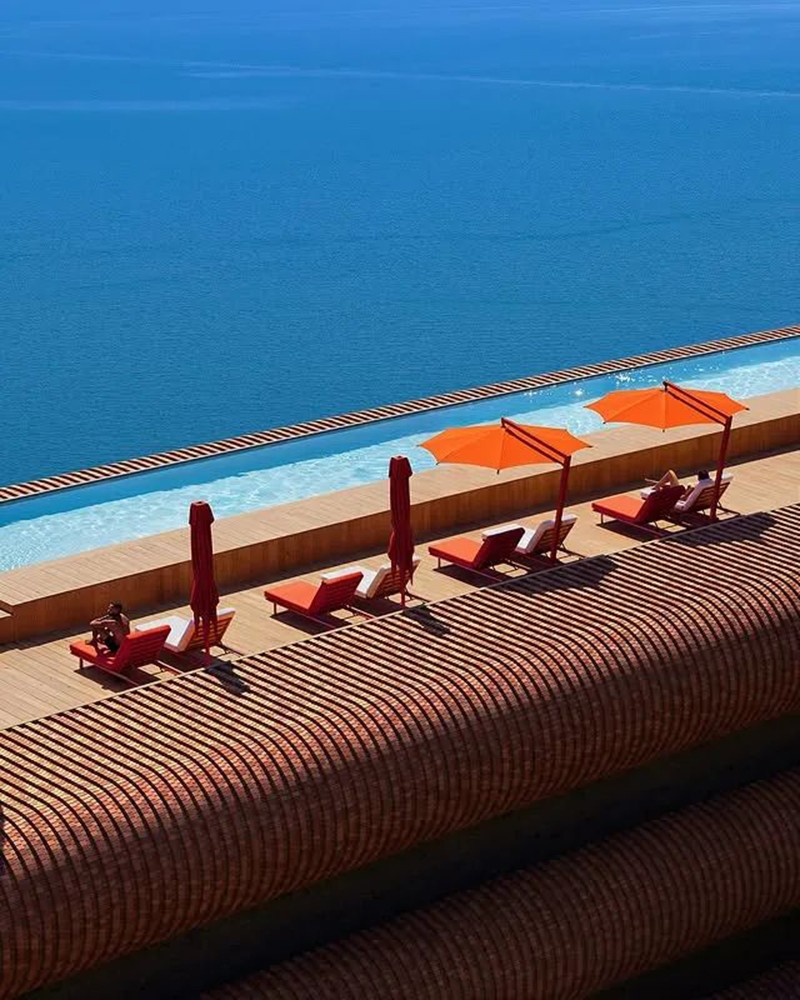 在懸崖之畔,建筑與自然相擁。盤旋的車道似絲帶纏繞山間,錯落的建筑如精巧積木嵌入綠意。車輛靜臥其中,行人悠然漫步,山海為幕,奏響一曲人類巧思與自然壯麗的和諧樂章。